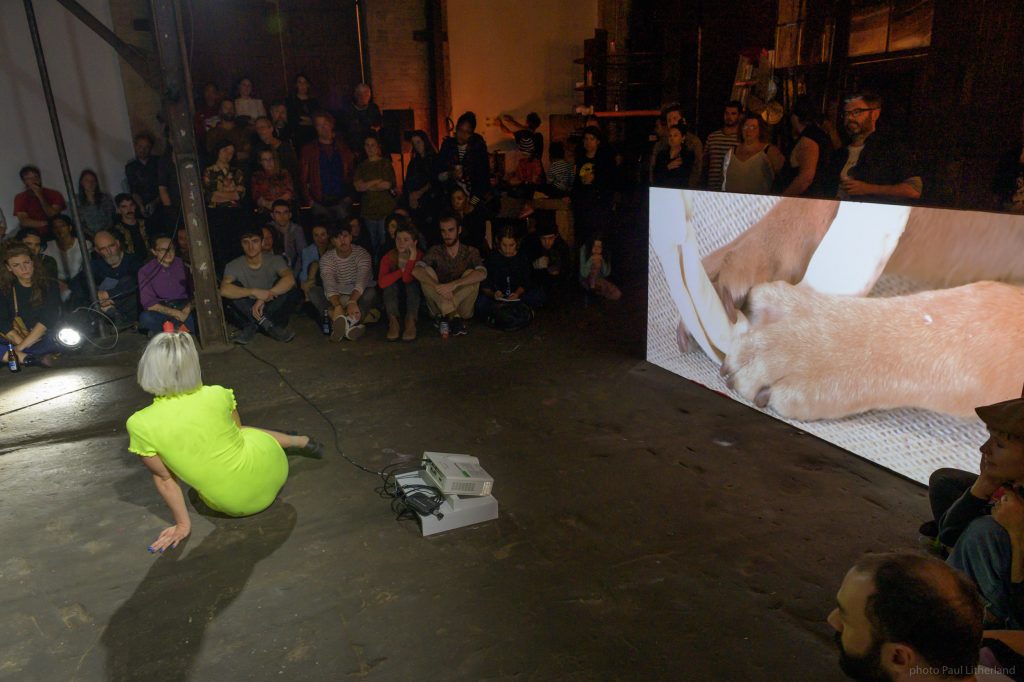 Emma-Kate Guimond a une formation en danse contemporaine, mais son médium de choix est le diaporama. Elle est payée pour performer. Ses performances sont incarnées, difficiles, désespérées, colorées et drôles. Employant gestuelle, images et texte, elle travaille avec une gamme de modes performatifs oscillant entre l’inconscient, le presque rien, le technique, le brutaliste, l’expressionniste et le dramatique, afin de situer et de resituer le pouvoir et le protagonisme.