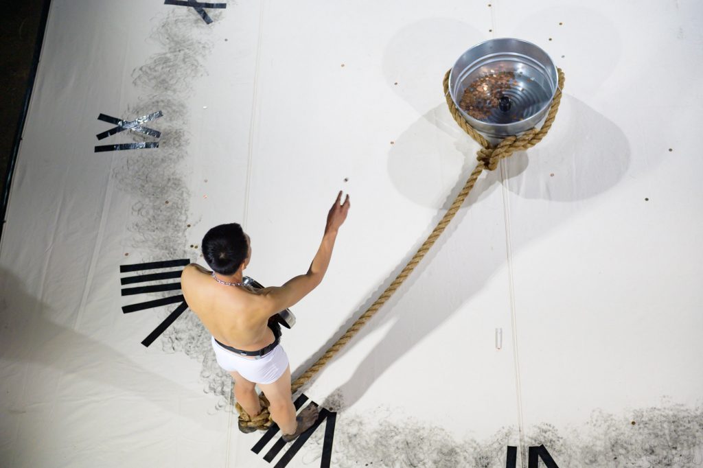 Débutant son parcours à Shanghai, où ses travaux de photographie s’attachaient au thème universel de l’angoisse urbaine, Miao a immigré à New York, élargissant ainsi sa vision des rues urbaines pour les percevoir comme une scène publique plus conceptuelle. Sa pratique performative s’étant déployée à travers divers médiums, il a, entre autres, mêlé son corps nu aux rues sombres de New York à minuit, voyagé dans une valise tirée par sa mère à travers les foules, diffusé des performances érotiques en direct sur un site de radiodiffusion pornographique interactif, et revêtu un costume d’homme d’affaires chinois pendant une année entière dans le cadre de sa maîtrise à la School of Art Institute de Chicago.